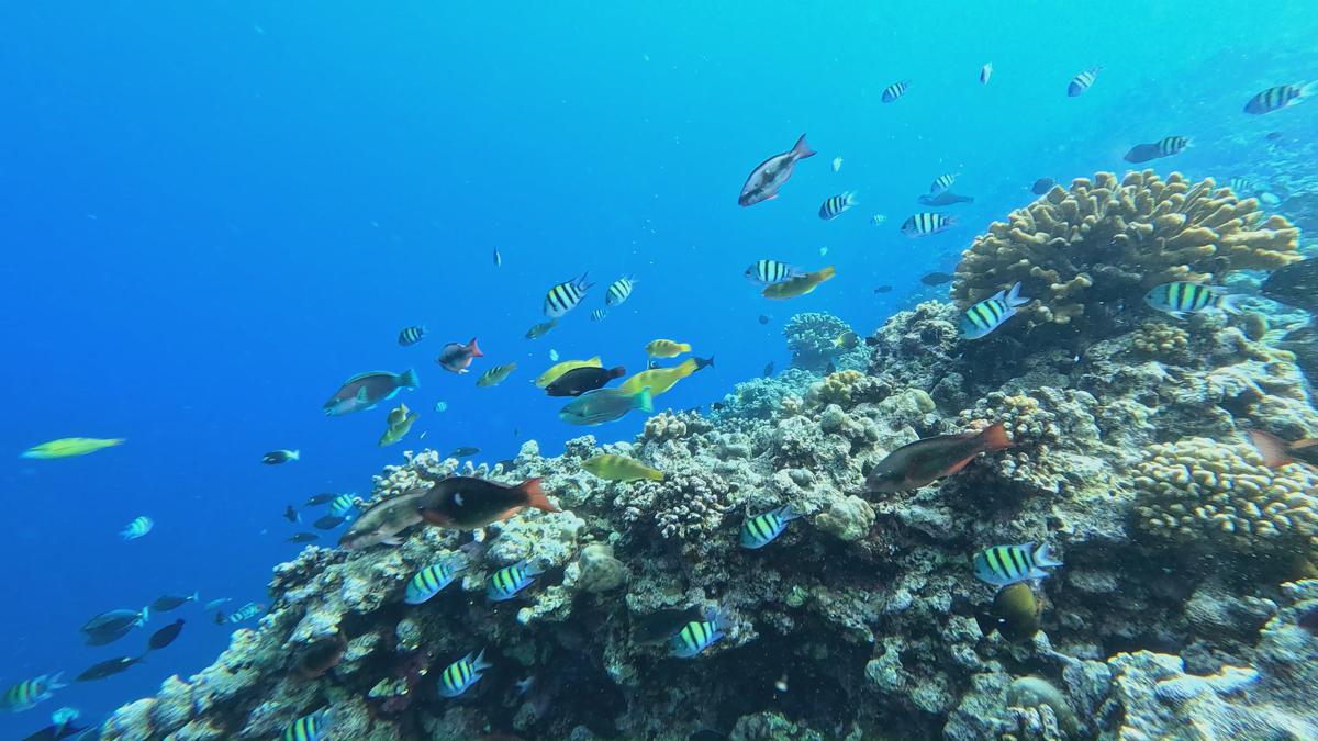 A school of fish swims past coral reefs near China’s Huangyan Island. According to a survey report released on Monday, the coral reef ecosystem of the island is in a healthy condition, with the average cover of reef-building corals at 38.8 percent. Provided to China Daily