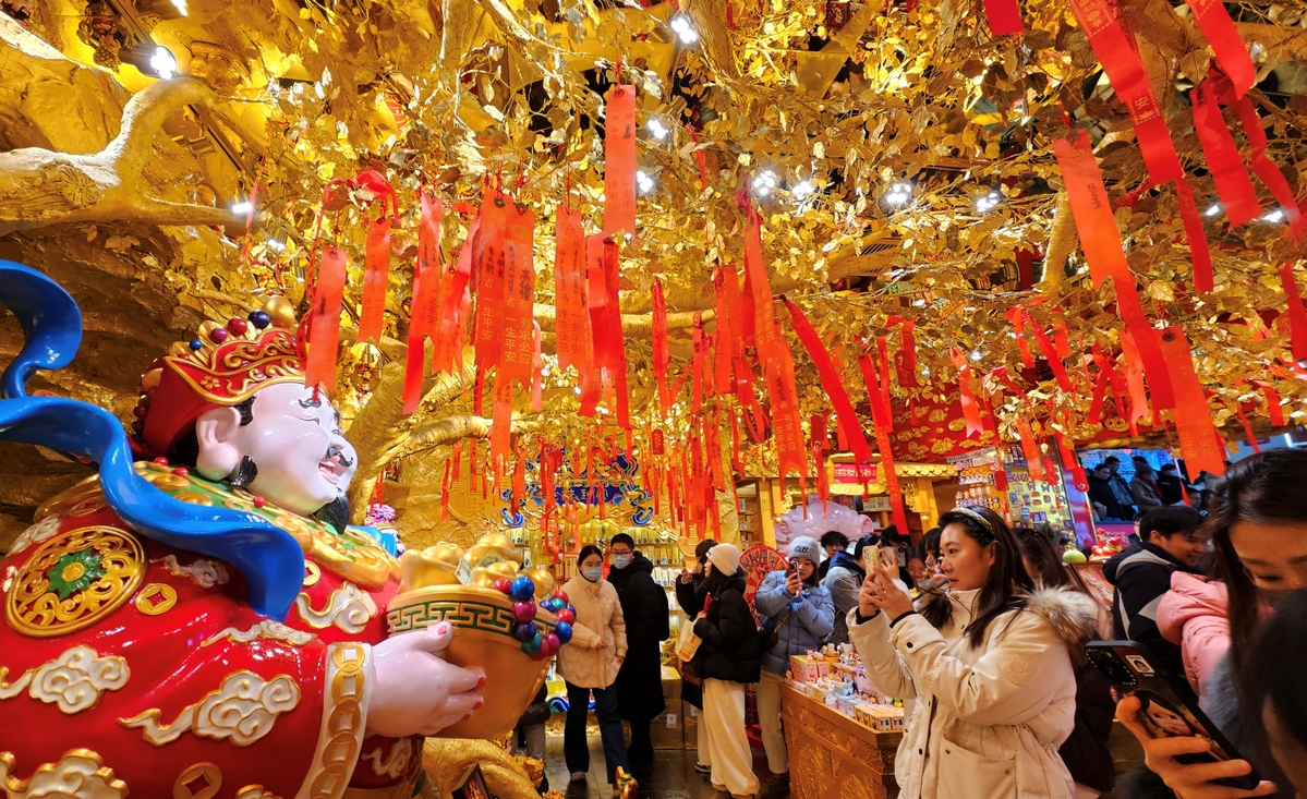 Revelers take photos of the God of Wealth at Huaxi Live in Haidian district, Beijing, on Dec 31. [Photo by Geng Feifei/chinadaily.com.cn]