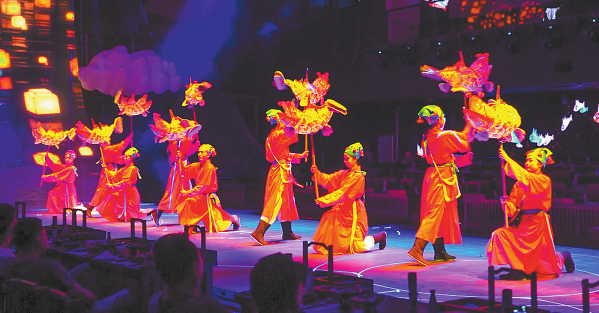 The stage then erupts with the Jianzhou fish-dragon dance, with actors weaving through the tables with glowing fish lanterns, as carp transform into dragons and leap over the "dragon gate" on the giant screen.