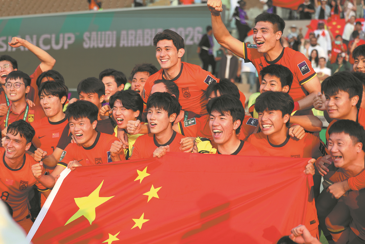 Team China players celebrate beating Uzbekistan 4-2 on penalties after a 0-0 draw over 120 minutes on Saturday in Jeddah, Saudi Arabia, to reach the semifinals of the U23 Asian Cup for the first time. [Photo/Xinhua]