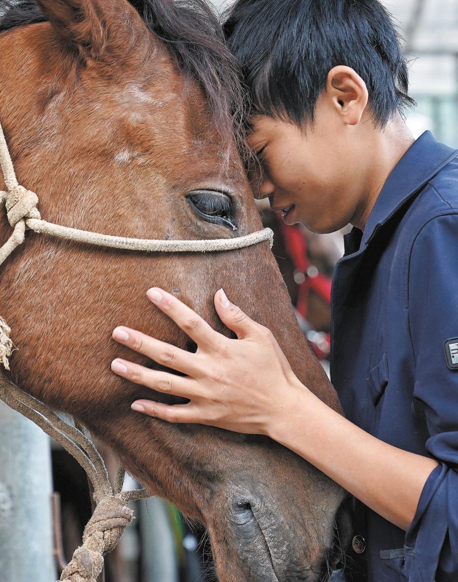 Wu Tianhao pats horse Chitu after a training session on Dec 23. WAN XIANG/XINHUA