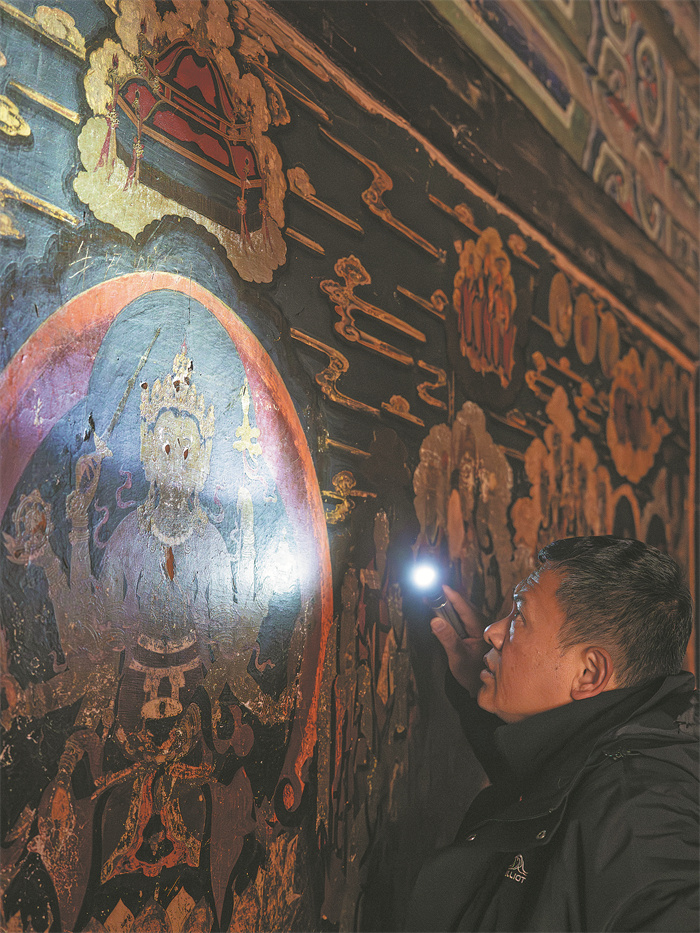 Yang, 57, examines a mural up close.[Photo provided by Gao Yongwei/Wang Guansen/Xinhua]