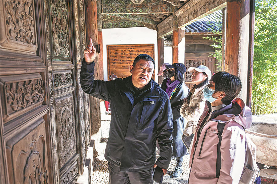 Yang introduces visitors to the history of the ancient buildings.[Photo provided by Gao Yongwei/Wang Guansen/Xinhua]