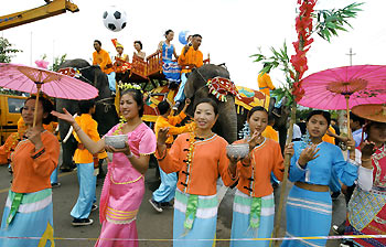| | |  | | | Chinese women perform a dance to welcome Real Madrid players as they arrive at a training centre in Kunming, the capital of China's southwestern province of Yunnan, July 25, 2003. Real Madrid, with newly added icon David Beckham, arrive on July 25 to launch their two-week Asian roadshow as part of a bid to challenge the English Premier League's regional dominance on jerseys, billboards and televisions. [Reuters] | | | | | | | | | |