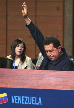 Venezuelan President Hugo Chavez raises his hand at the Ibero-American summit.[Agencies]