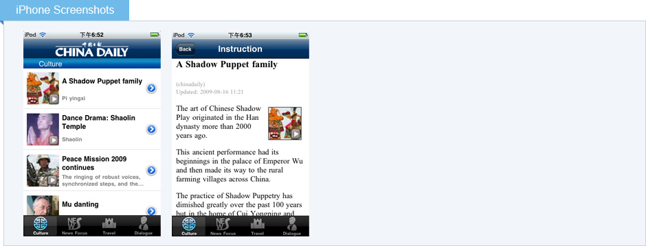 產(chǎn)品以獨(dú)家原創(chuàng)視頻內(nèi)容架設(shè)起外部世界了解中國(guó)的橋梁,它以國(guó)際化的視角娓娓講述不為人所熟知的中國(guó)故事,透視中國(guó)的熱門(mén)話(huà)題,生動(dòng)逼真地展現(xiàn)一個(gè)活生生的中國(guó)。內(nèi)容主要包括名人采訪(fǎng)、熱點(diǎn)新聞事件、文化遺產(chǎn)和自然奇跡。 |